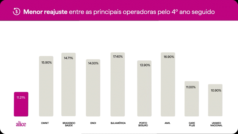 GIF com gráfico mostrando o reajuste da Alice em 2025, 2024, 2023 e 2022: o menor reajuste do mercado por 4 anos seguidos